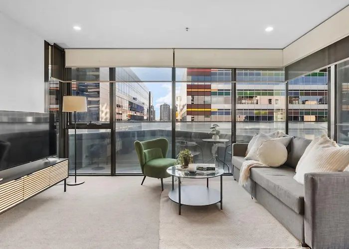 Als u in Docklands Apartment Escape Melbourne van 130 m² verblijft, kunt u de Eureka Tower bereiken, gelegen op loopafstand van ongeveer 25 minuten ervandaan.